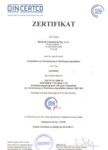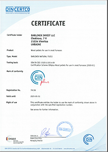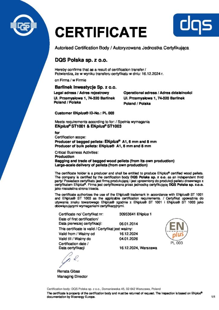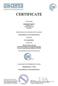 Pe 15.05.2009, compania Barlinek a obținut prestigiosul certificat DIN plus pentru peleții de lemn fabricați. În iulie 2010, am obținut certificatul Din Plus și pentru ecopeleții noștri produși în Vinița, Ucraina. Astfel, calitatea înaltă a produsului a fost confirmată și dovedită de organismul de certificare recunoscut internațional DIN CERTCO.